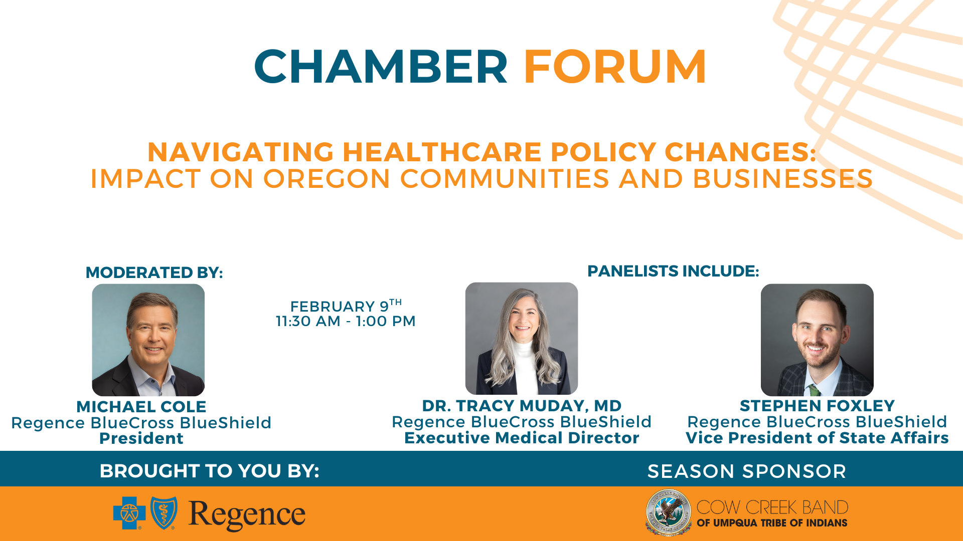 Michael Cole, President of Regence BlueCross BlueShield, will lead a panel discussion featuring Dr. Tracy Muday, Executive Medical Director for Regence, who will examine the implications of policies and their short-term and long-term effects on patients, employer costs and the broader healthcare system. The panel will also feature Stephen Foxley, the Regence Vice President of State Affairs, who will address the challenges and opportunities facing state and federal policymakers and how those decisions directly impact communities throughout Southern Oregon.